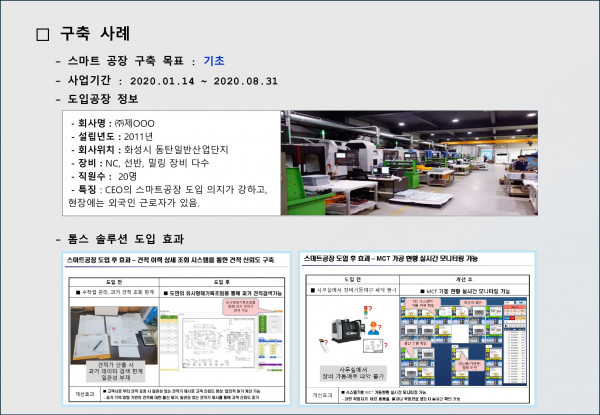 - 스마트공장 구축 후 불량률 감소와 납기 단축과 같은 생산성 향상 효과가 있었음.